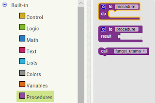 Sesuaikan block menjadi seperti diatas, jika bingung cara membuat fungsi_utama diatas, fungsi_utama dibuat menggunakan block prosedur. Kemudian dipanggil dimana fungsi prosedur tersebut akan dijalan. Pada block diatas prosedur fungsi_utama berfungsi untuk memvalidasi inputan dengan data yang ada di TinyDB. Jika benar maka halaman akan dialihkan ke screen home. Sedikit pintasan agar mempermudah kamu dalam mencari block dengan cara SHIFT + HURUF APA SAJA secara bersamaan, akan muncul kolom input pencarian block. Untuk menggunakan prosedur yang telah dibuat dengan cara buka blocks, kemudian Procedures.